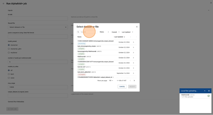 Step 3. Click "Select dataset or file" to select a pre-uploaded dataset from the 'input_dataset_id' field. When you click on the input field, a dropdown menu will appear, showcasing all available datasets that have been previously uploaded to the system. Take a moment to review the list and identify the dataset that best suits your analysis needs. It's important to note that you should select the entire dataset rather than individual files contained within it, as the process is designed to work with datasets as a whole. To aid in your selection, you may see additional details such as dataset names, descriptions, or timestamps indicating when they were uploaded. Once you have made your selection, confirm your choice to proceed to the next steps in the Alpha Fold analysis workflow.